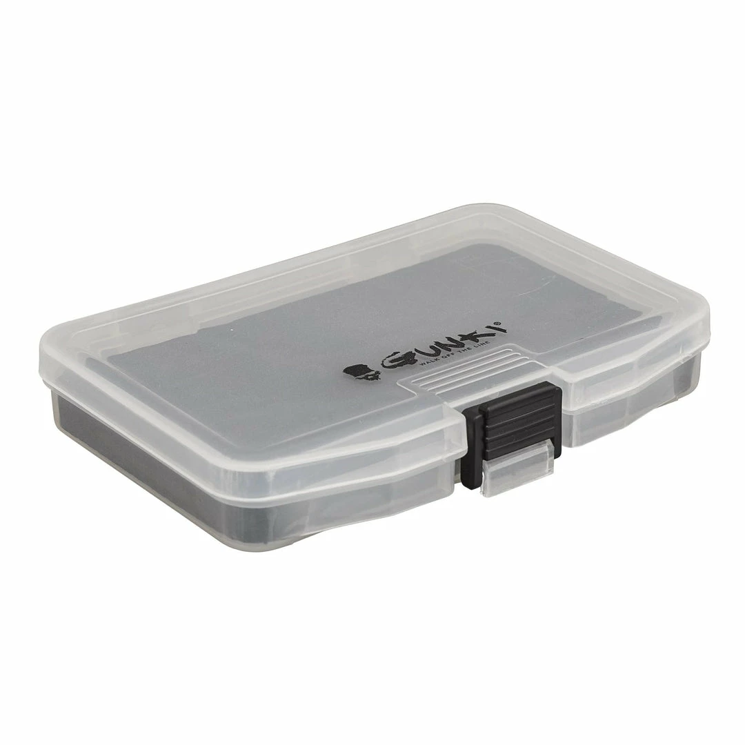 Transparent ultra flat box that slides easily in your pocket. The base is covered with high density EVA with 10 storage compartment dividers spaced 8mm apart. Handy box for spoons and small lures. Comes with an eyelet on the outside to attach a string or cord.