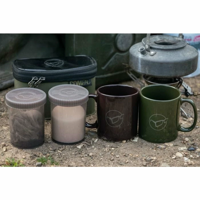 Following on from the roar away success of the popular Compaq 3 piece tea set. The development team at Korda thought long and hard on a follow up, working tirelessly day and night to bring you the game changing Compac 2 piece tea set. Featuring a Compac tea set pouch that perfectly takes a pair of glossy Korda branded mugs, plus a couple of branded screw top containers. Ideal for housing your teabags and sugar. They’ve even included a carpy black plated stainless steel spoon complete with laser etched Korda logo.