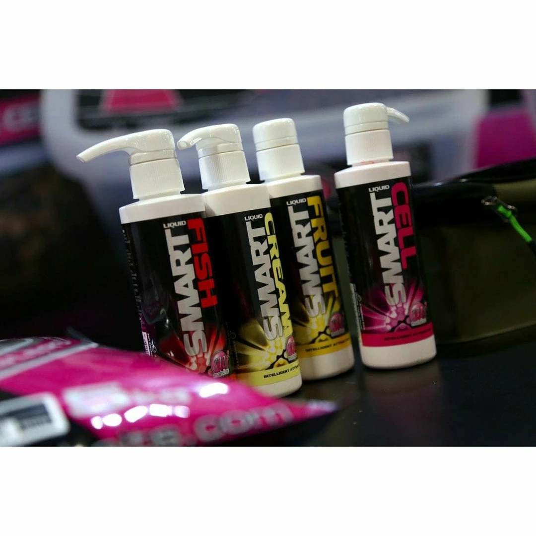 uch more than a liquid food, much more than a liquid attractor, Smart Liquid is ‘intelligent’. Water is the catalyst to Smart Liquid infiltrating it’s underwater environment; throughout the bottom substrate horizontally then climbing vertically, impregnating the entire water column with advanced compounds or free aminos, palatants and highly stimulatory trace elements.Simply coat boilies, pellets, particles, floaters and hookbaits with Smart Liquid, or add it to Groundbaits at the mixing stage. Add as required. Due to Smart Liquids unique formulation, it’s impossible to overload.Available in 250ml bottles and four flavour variants; Cell, Fish, Fruit and CreamPVA friendly