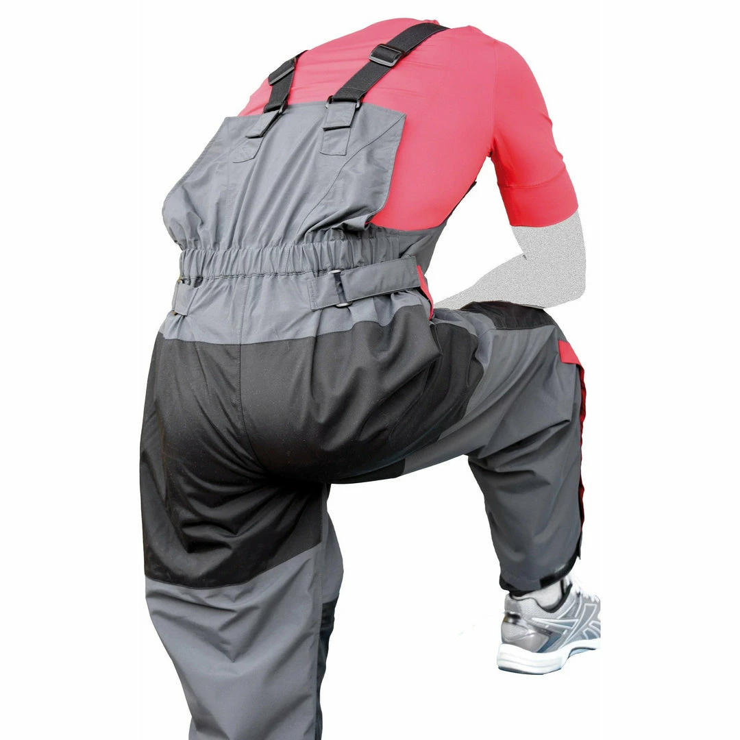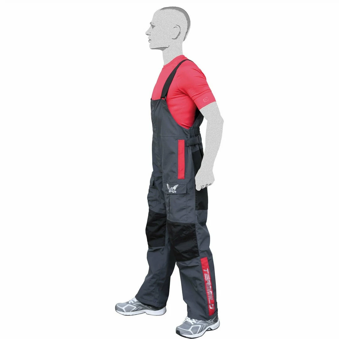 Made from highly waterproof nylon material with 10.000mm water column, this exceptional bib and brace is the ultimate in technical sports clothing. Features include adjustable elastic braces, a two-way zipper with Velcro flap closure, two pockets on the legs with elasticated hook-sealed zippers protected by contrasting red flaps, two pockets on the legs with elasticated hook-and-loop fasteners, two Velcro adjustable waistbands for snug fit, zipped leg bottoms and adjustable Velcro straps at ankles. Reinforced ripstops panels at knees and seat. The interior features a polyester membrane with heat-sealed seams.