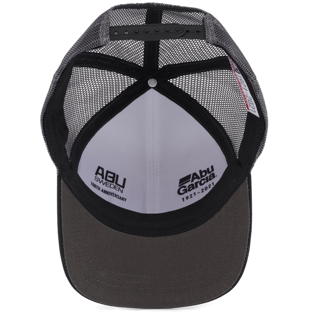 Abu 100th Anniversary Special Edition Trucker. 6-panel mid-profile construction and semi-curved brim with heavyweight stiffener maintains fit and shape. Lightly washed heavy mesh back for lasting performance and wear. 3D puff embroidered ABU SWEDEN logo on front. Dark colored underbrim to reduce glare and a custom printed buckram liner celebrates ABU SWEDEN and Abu Garcia 1921-2021 Anniversary.