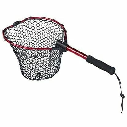 Rubber landing nets, The red anodized framework is strong, the rubber net material is flexible and strong , a hooks/trebles will never get stuck in it. The Retractable versions are compact when needed and long enough when retracted and ready to land your dream catch. All have Neoprene handles that provide the needed grip. The kayak/float tube version has an elastic handle cord integrated in the handle this way you can keep it fixed to your boat or belt and still have enough reach to land the fish.