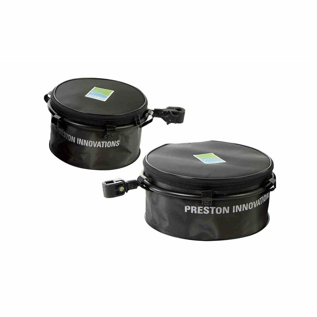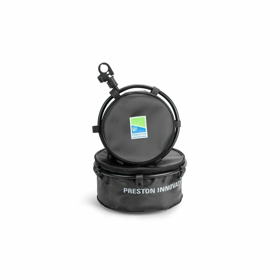 A waterproof EVA groundbait bowl with a rigid hoop, for attaching directly to seatbox or platform legs. Collapsible for easy storage and transportation. SnapLok for ease of transport and assembly.
