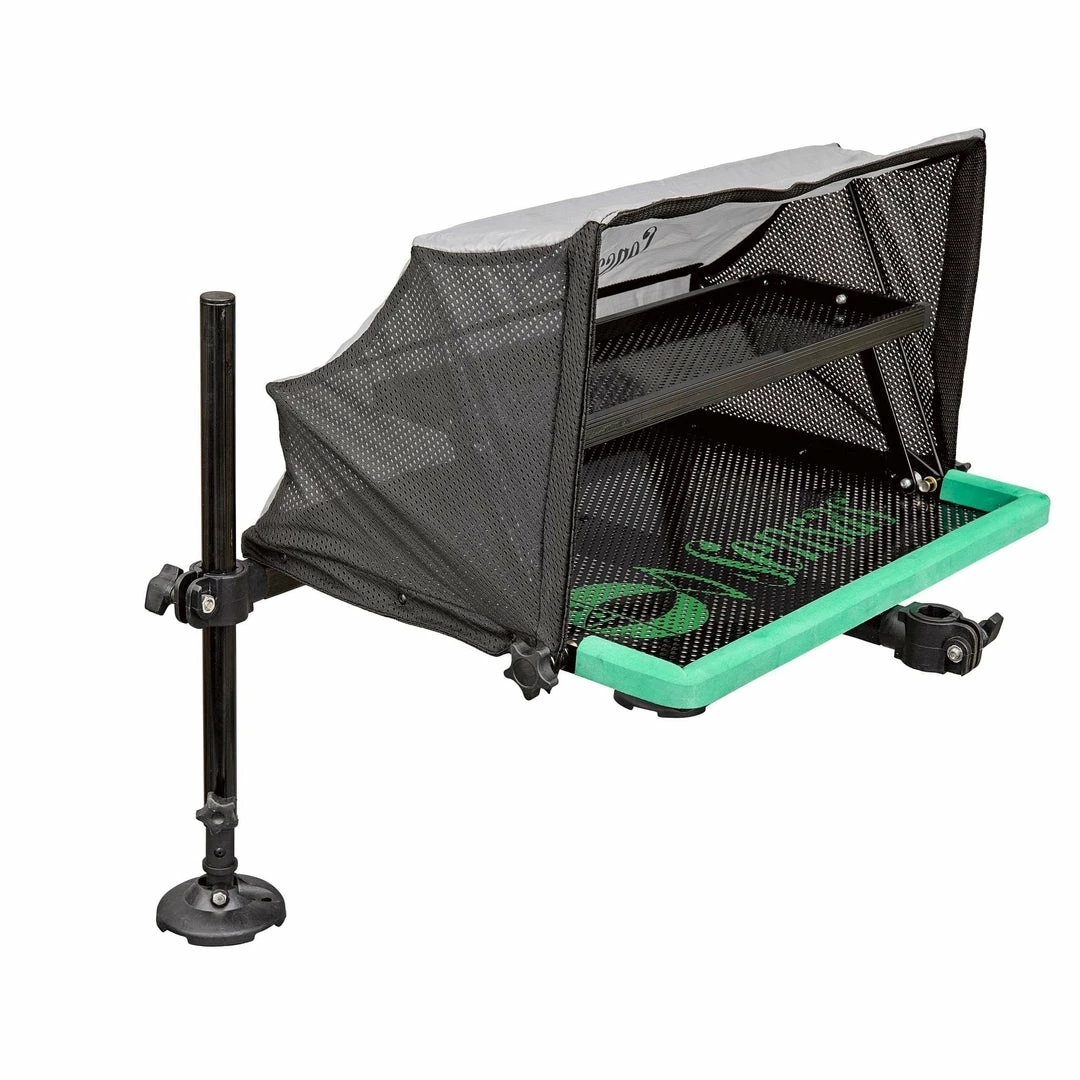 Side tray with a folding section that can be used to create a separate surface for different bait boxes or tackle bits. Or you can leave the side tray as a single unit if you like.