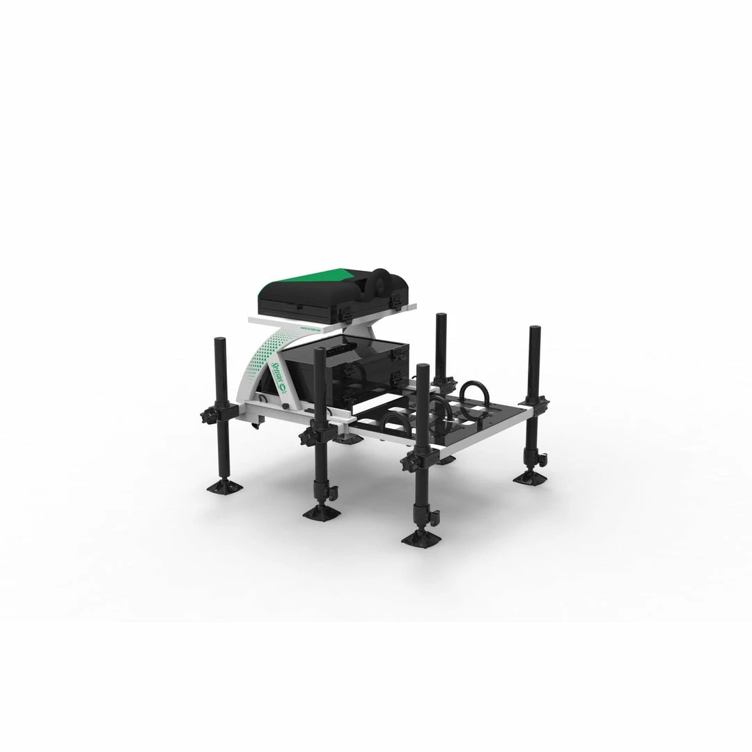 Integrated seatbox system with : 2 in 1 cushion system – Sliding footplate –Integrated keepnet attachment on the front of the footplate – 4 telescopic 36 mm legs – 2 standard 36 mm legs – 1 x 80 mm tray unit – 1 x 40 mm base tray unit – 1 cover – 3 spirit levels – 2 half drawers under the seat – 1 carry strap – Rear wheel attachments –Attachment pegs for setting up on concrete banks.