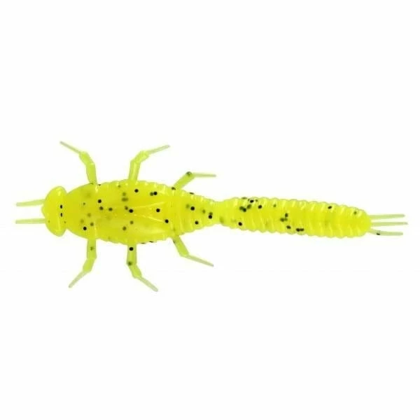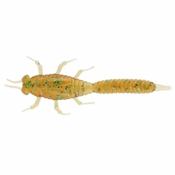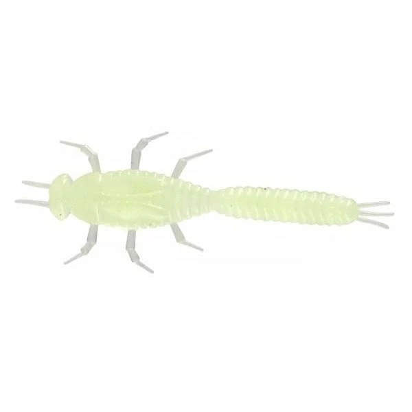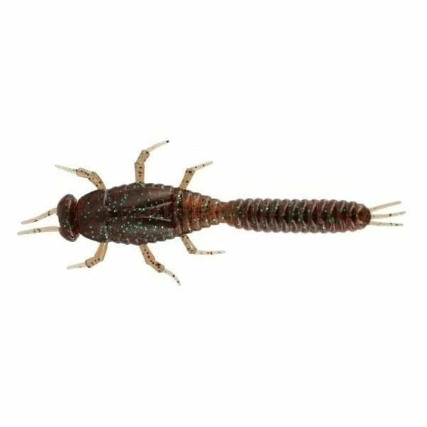 Finally fished on a micro head it looks like a small beetle larvae or caterpillar –great bounced along the flow seeking out fish feeding on small insects on the riverbed. Lends itself to any light rig style- weightless, drop shot, split shot, micro jig or light Texas…