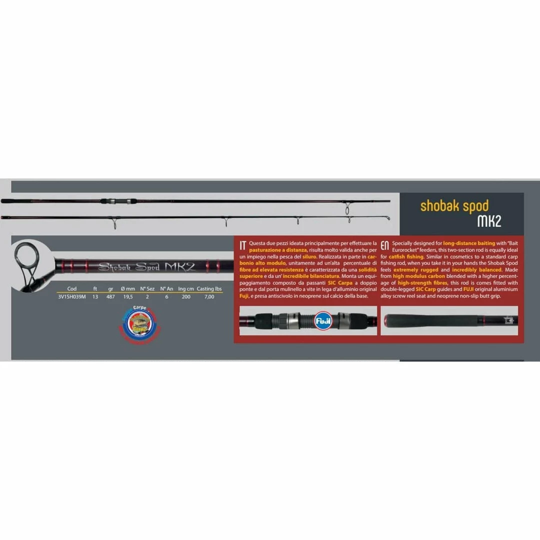Specially designed for long-distance baiting with “Bait Eurorocket” feeders, this two-section rod is equally ideal for catfish fishing. Similar in cosmetics to a standard carpfishing rod, when you take it in your hands the Shobak Spod feels extremely rugged and incredibly balanced. Made from high modulus carbon blended with a higher percentage of high-strength fibres, this rod is comes fitted with double-legged SIC Carp guides and FUJI original aluminium alloy screw reel seat and neoprene non-slip butt grip.